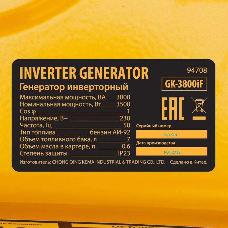 - Наименование Генератор инверторный GK-3800iF, 3,8 кВт, 230 В, ручной старт DENZEL
