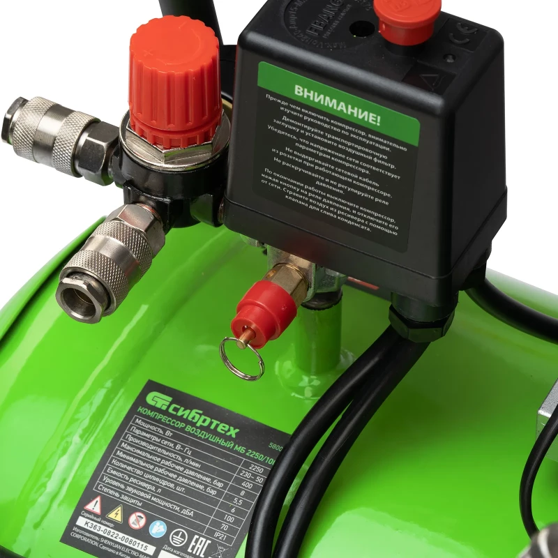 - Наименование Компрессор безмаслянный малошумный МБ 2250/100, 2250 Вт, 100л, 400 л/мин Сибртех