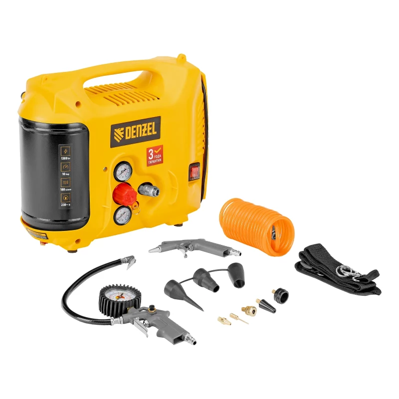 Компрессор воздушный DL1300, 10 бар, 1,3 кВт 180 л/мин 5 л, с набором аксессуаров Denzel