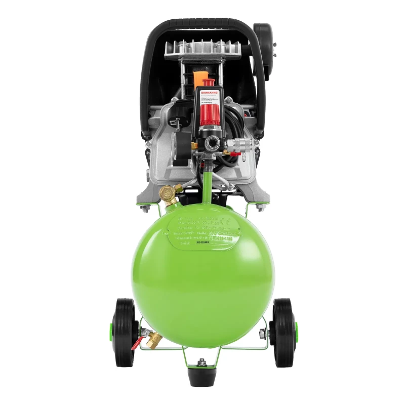 - Широко разнесенные колеса и удобная транспортная ручка позволяют без труда перемещать компрессор к месту работы, а опора обеспечивает устойчивость в стационарном положении.