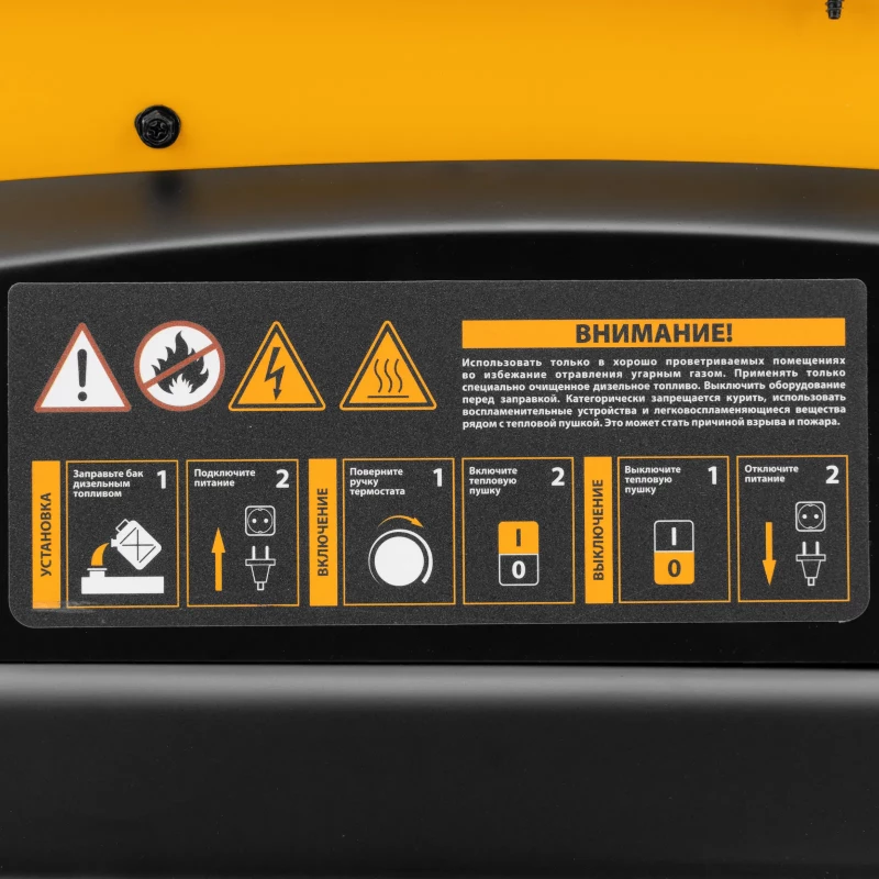 - Комплектация Дизельная тепловая пушка - 1 штРукоятка - 1 штКомплект крепежа - 1 штРуководство по эксплуатации с гарантийным талоном - 1 шт